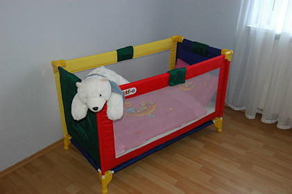 Es ist ein Kinderbett vorhanden.Desweiteren steht ebenso ein Kinderhochstuhl zur Verfügung.